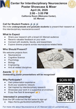 Please plan to join the Neuroscience Community at UC Merced on April 24th from 2:00–3:00 PM in the California Room (Welcome Center) for a fun and friendly interdisciplinary event!